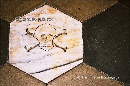 Nečekaně hrozivé zdobení dlažbové podlahy farního kostela ve vesnici Intragna, údolí Centovalli, kanton Ticino, Švýcarsko.
