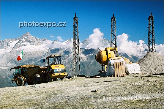 Milovníci fotografování ve Švýcarsku často nadávají. Dokonalé záběry přírody či měst často hyzdí jeřáby a další stavební nepřístojnosti. Stále a všude se zde totiž staví. Tento alpský panoramatický pohled se nám naskytl na Gornegratu, z něhož jsou jinak úchvatné výhledy na okolní alpské čtyřtisícovky včetně provokujícího Matterhornu. Wallis, Švýcarsko.