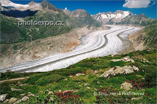 Putování po hřebenové stezce kolem Aletschského ledovce nabízí k obdivování nejen ledový skvost, ale i nádherné trsy alpské růže milující nadmořské výšky nad 2 000 m. Wallis, Švýcarsko.