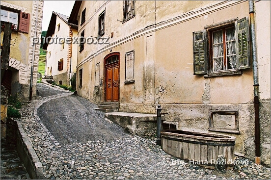 Zákoutí jak ve středověku ve vesničce Ardez vyznačující se půvabnými malovanými domy. Údolí Engadin, Graubünden, Švýcarsko.