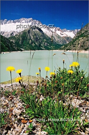 Asi nejkrásnější jezero, které jsme při cestování Švýcarskem objevili - Göscheneralpsee v Uriských Alpách. Vodní ráj zakončuje údolí Göschener Tal. Voda jezera je tyrkysově mléčná, břeh kamenitý i travnatý s pestrobarevným kvítím. Uri, Švýcarsko.