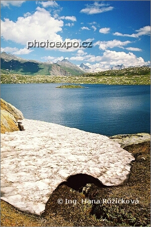 Průsmyk Grimsel s překrásným Totensee aneb Jezerem mrtvých, kde ani v létě nechybí led a sníh. Jezero je připomínkou krvavých bojů mezi Francouzi a Rakušany v r. 1799. Wallis, Švýcarsko.