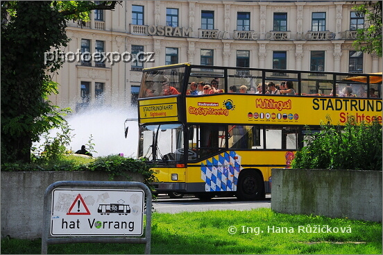Dvoupatrový vyhlídkový autobus u Karlsplatzu v centru Mnichova. Hlavně pozor na tramvaj! Německo