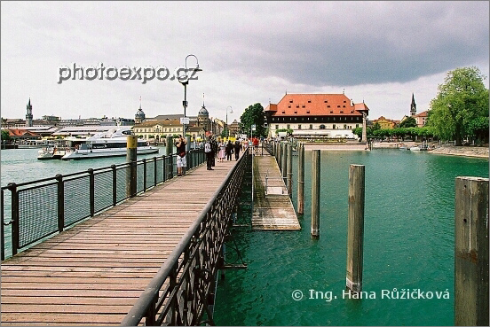 Výhled na Kostnický koncil (Konzil) z mola vedoucího k soše Imperia. Kostnice (Konstanz), Německo.