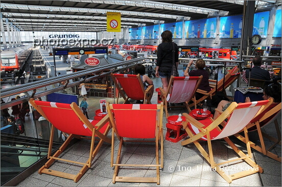 Mnichovské hlavní vlakové nádraží (Hauptbahnhof) pohledem z patra kaváren. Německo