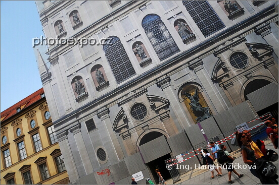 Copak to tak asi je? Že by průčelí velkého kostela? No, skoro... ale jen jako. Spíše je to taková v poslední době použivaná mystifikace - když se něco trojrozměrného opravuje, zakryje se to dvourozměrnou namalovanou imitací. Tak to bylo v době mé návštěvy v Mnichově s kostelem Sv. Michaela na Neuhauser Strasse. Imitace vážně povedená. Německo