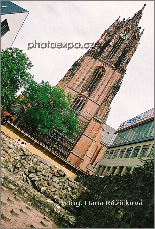 Frankfurtská katedrála zasvěcená svatému Bartolomějovi. "U nohou" se jí skví římské vykopávky. Frankfurt nad Mohanem, Německo.