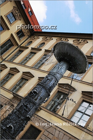 Vysoká fontána před budovou Bayerisches Landesamt für Statistik na náměstí lemujícím Neuhauser Strasse. Mnichov, Německo.
