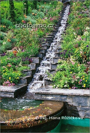 Kašna s kaskádovitým přívodem vody v botanické zahradě Mainau. Německo
