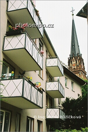 Moderní domy obývané milovníky větrníků na pozadí kostela Dreikönigskirche. Frankfurt nad Mohanem, Německo.