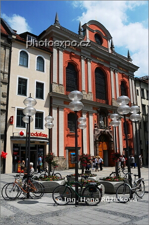 Pouliční lampy jako opěrky vhodné k zaparkování a připoutání kol na pozadí kostela. Neuhauser Strasse, Mnichov, Německo.