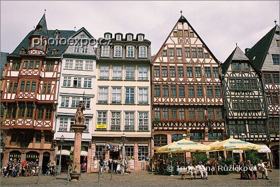 Römerberg, historické centrum Frankfurtu nad Mohanem s nádhernými hrázděnými domy. Německo