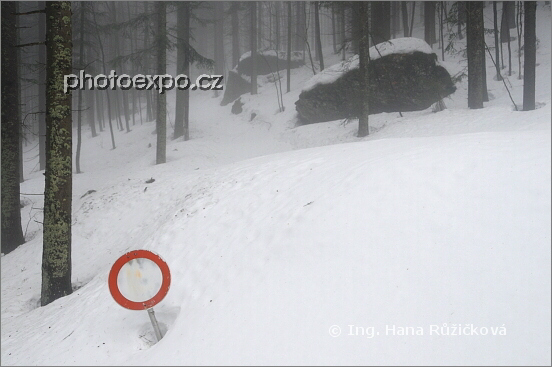 Zákaz vjezdu! Hlavně nepřehlédnout! ... Už by vás v tom sněhu nikdo neneašel. Sníh, mlha, zima a značka zákazu vjezdu v lese u Bodenmais. Německo