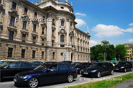 Přehlídka černých limuzín před historickou budovou Justičního paláce (Justizpalast) v centru Mnichova. Německo