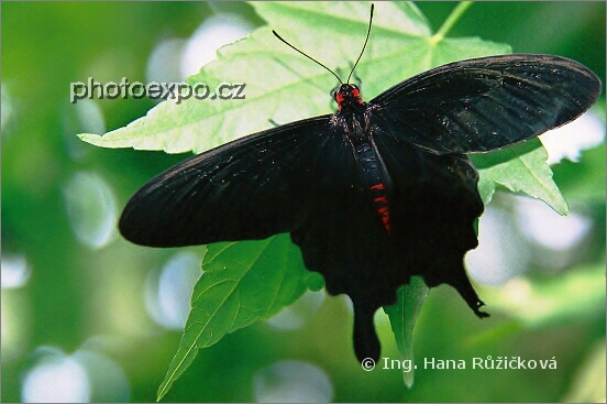 Černý, nebezpečně vyhlížející motýl Pachliopta kotzebuea, obyvatel botanické zahrady Mainau. Německo