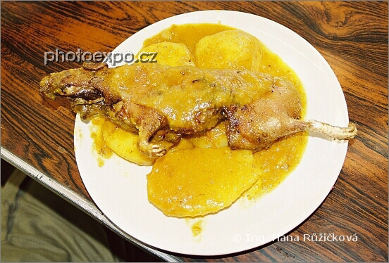 Dobrou chuť! Typickým peruánským jídlem je morče. Já jsem jako vegetarián ušetřena ochutnávání, ale přítel to zkouší. Na talíři mu leží celá půlka morčete s plátky brambor. Maso je však údajně velmi tvrdé a - aniž to vypadá - je ho málo.