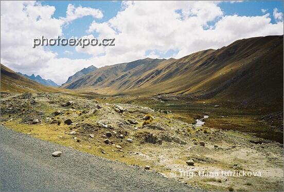 Krajina cestou z Huarazu k Chavínu de Huántar, fantastická pustina kolem nejvyššího bodu cesty, tunelu Kawish. Peru