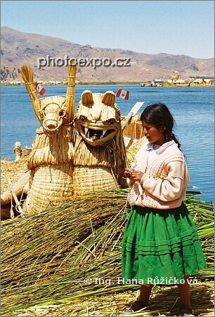 Peruánská dívka na plovoucích rákosových ostrovech Islas Uros na jezeře Titicaca. U ostrova "kotví" typické lodě, vyrobené z rákosu tortora a se zajímavými příděmi v podobě různých bytostí. Peru