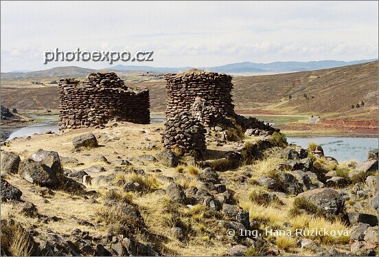 Starší chullpas ve tvaru včelích úlů - hrobky předincké kultury staré až 5 000 let. Sillustani, Peru.