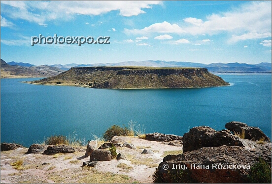 Posvátné jezero Umayo obklopuje pohřebiště Sillustani nedaleko jezera Titicaca. Peru