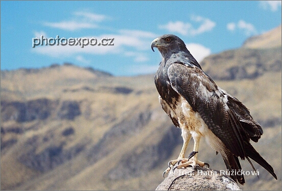 Dravec v Colca kaňonu. Nádherný pták sloužil jako lákadlo na turisty, s cílem upoutat jejich pozornost a přitáhnout je k nabídce místních Peruánek. Ty zde vystavovaly a prodávaly různé suvenýry, ručně pletené svetry z vlny alpak a další zboží. Peru.