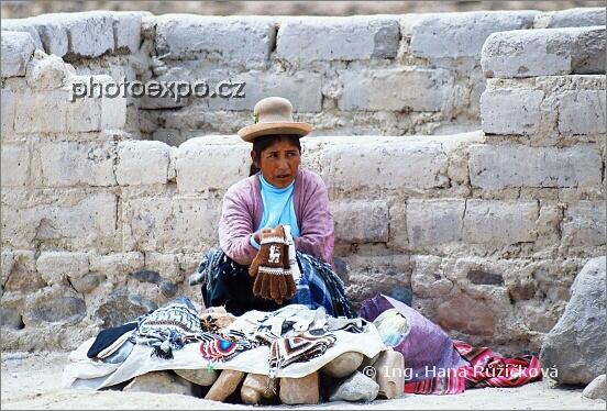 Peruánka nabízející své výtvory, především rukavce a čepice z alpačí vlny, na Altiplanu před vjezdem do krajiny Colca kaňonu. Peru