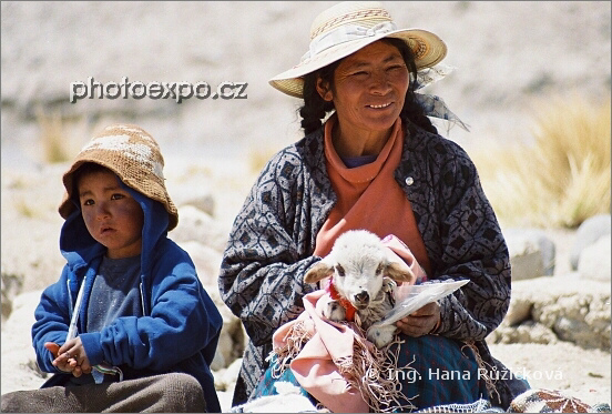 Matka se synem čekají na turisty, kterým by prodali své suvenýry - produkty z vlny lam alpak. Altiplano, Peru.