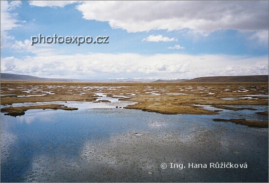 Mokřiny plné vodního ptactva cestou přes Altiplano do Colca kaňonu, Peru.
