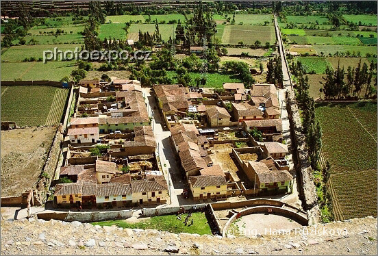 Městečko Ollantaytambo v Posvátném údolí řeky Urubamby pohledem z ruin inckého Chrámu Slunce. Peru.