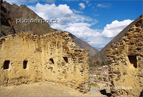 Průhled ruinami Chrámu Slunce na městečko Ollantaytambo a Posvátné údolí.