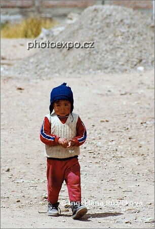 Malý peruánský chlapec v nehostinných končinách města Puna, hlavního přístavu na jezeře Titicaca. Peru