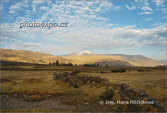 Půvabná krajina kolem Colca kaňonu nasvícená ranním sluncem. Peru