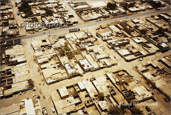 Městečko Nazca pohledem z Cesny letící nad planinou Nazca. Domy a ulice působí velmi stroze, chudě. Peru