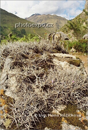 Stovky tilandsií, rostlin žijících ze vzdušné vlhkosti, podél začátku Inca Trailu na Machu Picchu. Peru