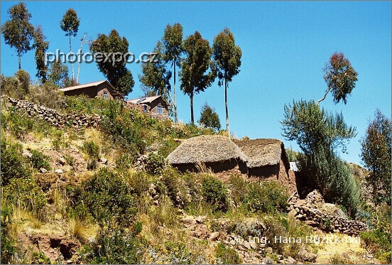 Krajina a domky ostrova Taquile, jednoho ze tří nejdůležitějších ostrovů jezera Titicaca. Peru
