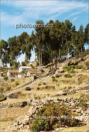 Krajina ostrova Amantani, plná malých terasovitých políček lemovaných kameny, s domky z vepřovic. Jezero Titicaca, Peru.