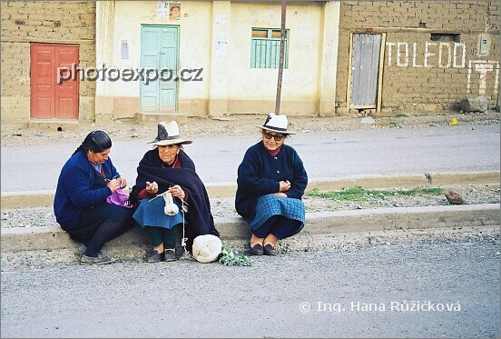 Proč štrikovat a povídat si doma, když to jde i uprostřed silnice. Peruánky ve vesnici NP Huascarán. Peru