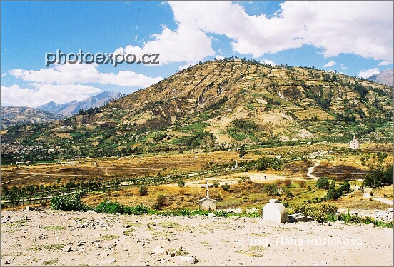 Výhled na místo neštěstí, Yungai, kde v r. 1970 přišlo pod lavinou utrženou z Nevado Huascarán o život na 70 000 lidí. NP Huascarán, Peru.