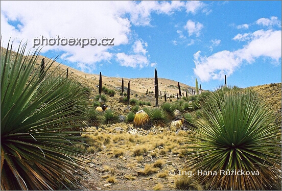 NP Huascaran a gigantické Puya Raymondi. Tyto rostliny jsou největšími bromeliemi na světě a vyskytují se pouze v pásmu nadmořské výšky 3 700 - 4 200 m. Dosahují výšky až 12 m a dožívají se 40 let. Peru