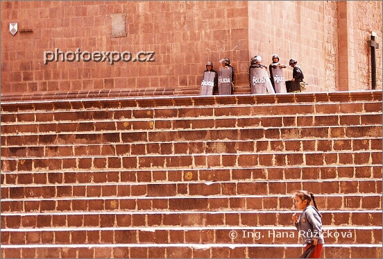 Policie u katedrály na hlavním náměstí Plaza de Armas v Cuzcu je připravena na ohlášenou demonstraci. Cuzco, turistická jednička v Peru, je na rozdíl Arequipy, městem značně levicovým. To se odráží i v počtu konaných demonstrací. Peru