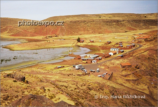 Nádherné okolí starobylého pohřebiště Sillustani. Dole je vidět parkoviště, kde náš mikrobus parkuje. Peru