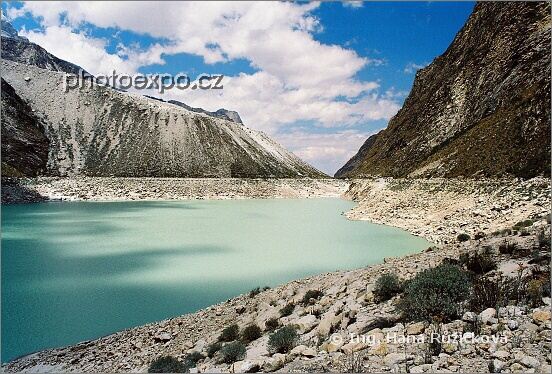 Národní park Huascarán, laguna Parón (4 185 m). Údajně nejkrásnější ledovcové jezero v NP Huascarán ležící mezi Nevado Huandoy a Nevado Aguja. Je 3 km dlouhé a 700 m široké. Jeho voda je úžasně tyrkysově mléčná. Obcházením jezera jsme riskovali životy, neboť - jak vidno z fotografie - jsou jeho břehy jednou velkou kamenolavinovou oblastí. A kolem nás také stále něco padalo...