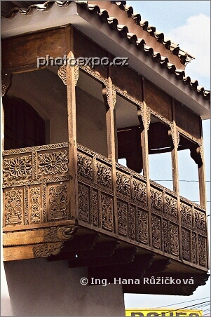 Dřevěný vyřezávaný balkon na jednom z domů v La Pazu. Bolívie