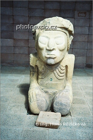 Socha nalezená v archeologickém komplexu Tiwanaku a umístěná v jednom ze dvou místních muzeí. Bolívie