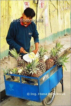 Typický pouliční prodej ananasu. Je libo ukrojit šťavnaté kolečko? La Paz, Bolívie.