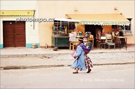 První setkání s bolívijskými domorodci po projetí chilského NP Lauca a překročení bolívijských hranic. Bolívijky stejně jako Peruánky často chodí v typickém pestrém oděvu se širokou sukní, kloboučkem a šátkem na zádech, ve kterém nosí děti, nákupy či jiný náklad.