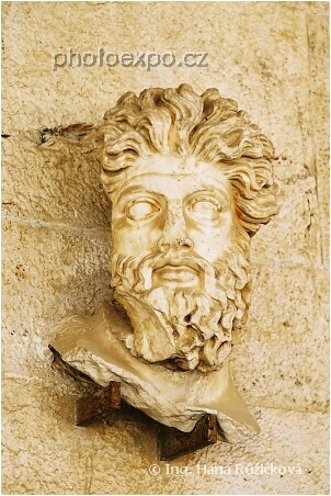 Antická hlava vystavená v Attalově stoe v athénské agoře.