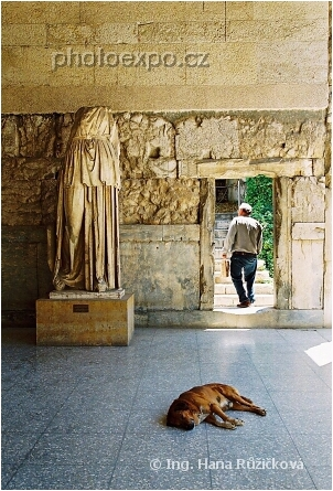 Zátiší se spícím psem v Attalově stoe v athénské agoře.