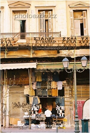 Krámek v domě na spadnutí. I takto se v Athénách běžně prodává.