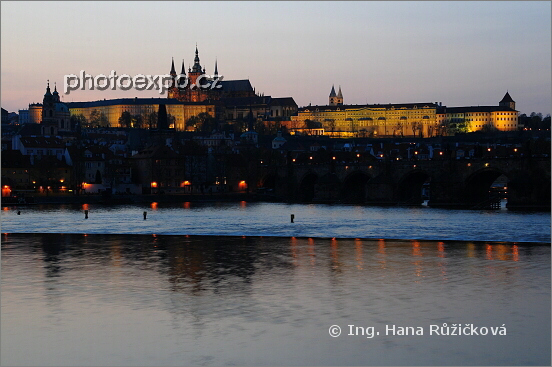 Večerní pohled na Pražský hrad za Vltavou, Praha.